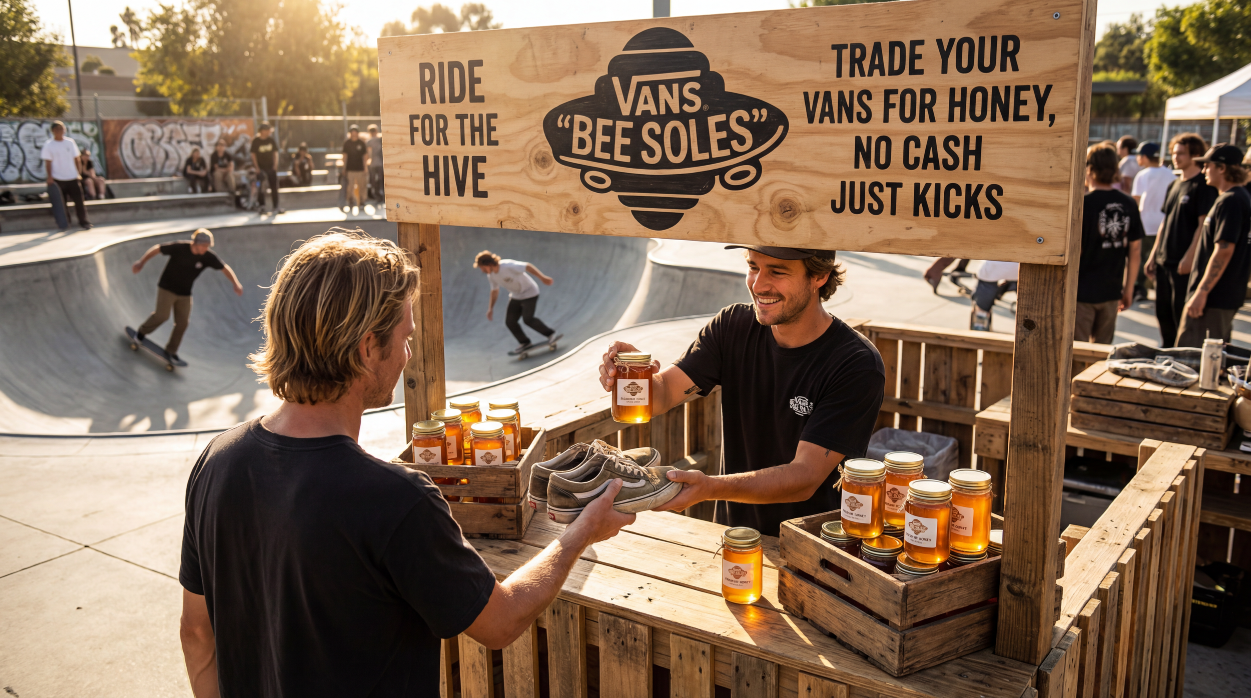 At skate parks and farmer’s markets, people are able to exchange their Vans shoes for a bottle of honey.
